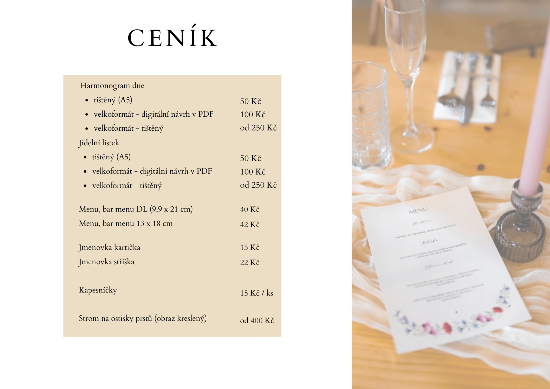 Jmenovky, harmonogramy, menu, etikety,...vše vytvořeno v jednotném designu a s láskou k detailu.